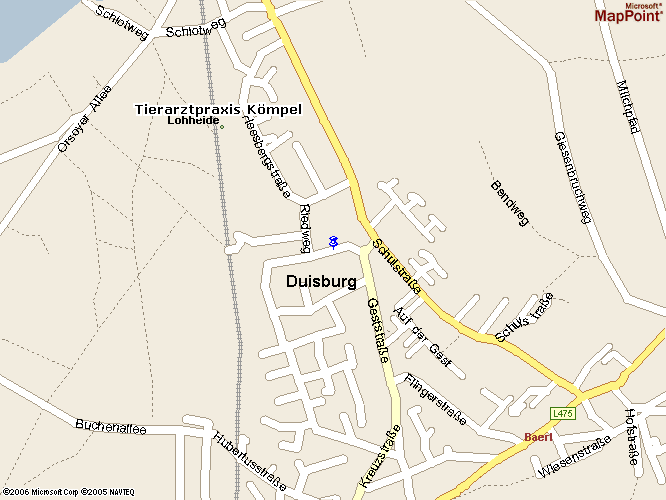 Kamp-Lintfort Nordtangente Richtung Moers, Duisburg Hinter der Autobahnauffahrt zur A57 an der nächtste Ampel links abbiegen in die Verbandstrasse Richtung Duisburg. (Vorbei an Repelen und Meerbeck.) Die vierte Ampel nach ca. 6,1 km links Abbiegen Richung Orsoy, DU-Baerl Nach ca. 1,5 km hinter dem Blumengeschäft linke Hand links abbiegen in die Schulstrasse. (vor der Kirche - Achtung 30zig Zone) Erste Straße links abbiegen, (nach ca. 700m) Geststraße (linke Hand Kosmetik Geschäft.) Sofort wieder rechts abbiegen - Hermann-Löns-Str. 50 m rechte Hand weiß-blaues Haus Parkplatz