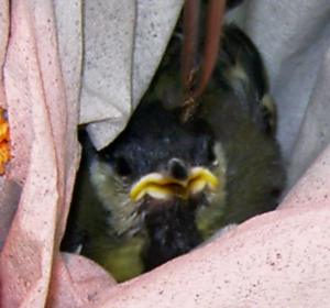 Im Frühjahr wurde uns eine kleine Kohlmeise gebracht. Sie war von einem Kind gefunden worden und wohl aus dem Nest gefallen, da sie erst wenig befiedert war. Leider war die Lage des Nestes nicht bekannt, sonst hätte man versuchen können, den Jungvogel wieder ins Nest zu setzen.
